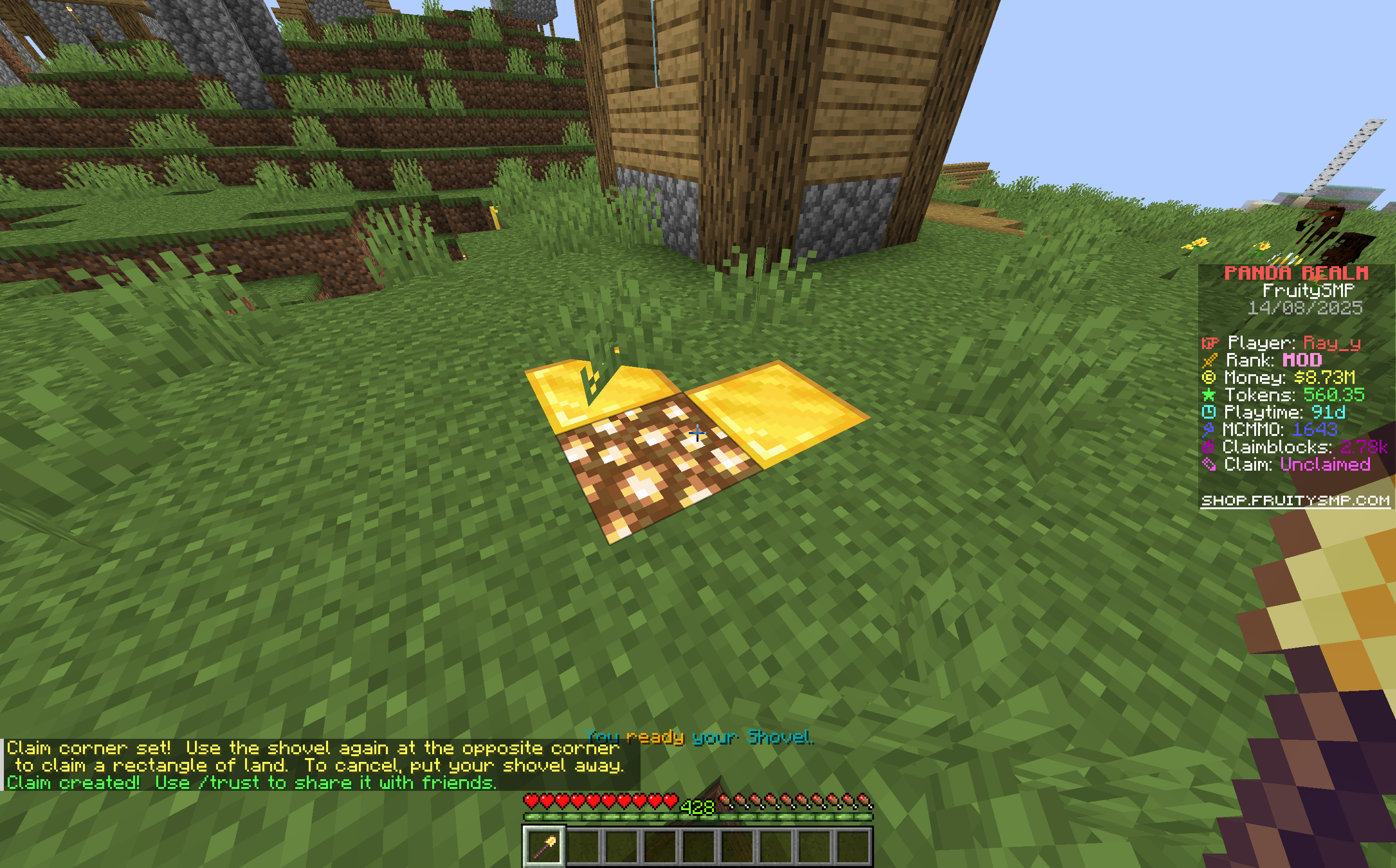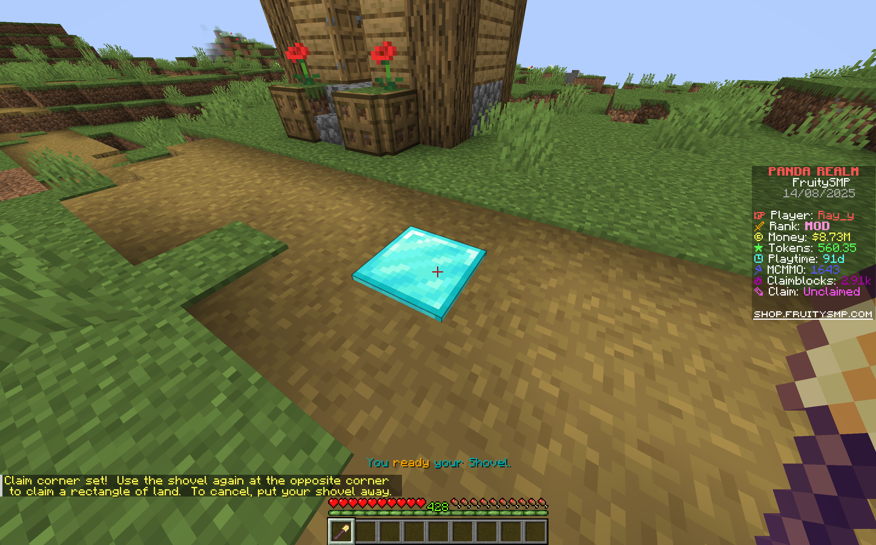 After that, while still holding the shovel and not switching to another space in your hotbar, right click the next corner of the area you want to claim. Your claim will then be created.